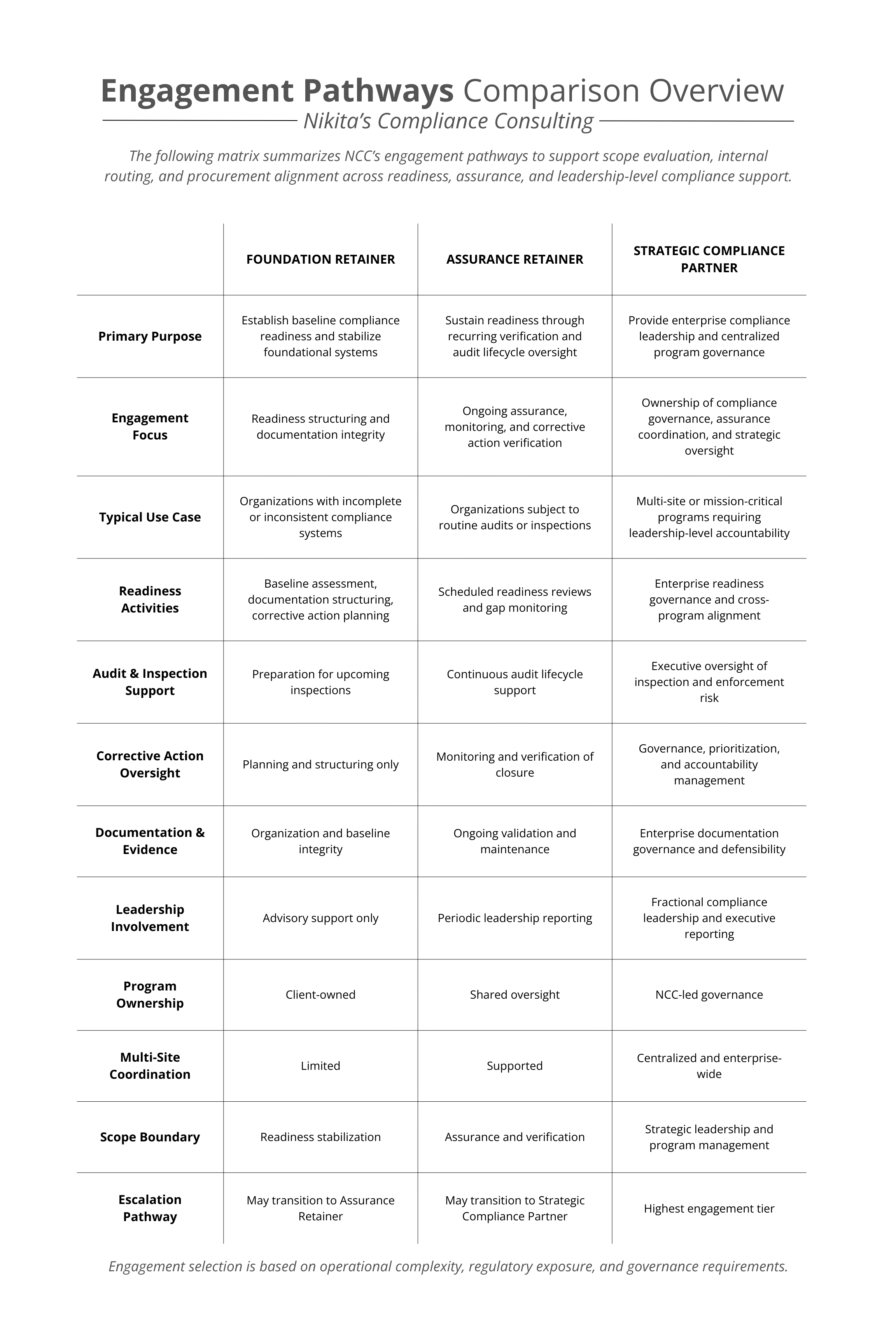 Engagements are structured to align with each organization’s operational maturity and regulatory exposure. NCC supports foundational readiness, recurring assurance, and strategic compliance leadership through clearly defined programs that integrate into existing operations without disrupting execution. This approach allows organizations to strengthen compliance performance while maintaining focus on mission continuity and service delivery.